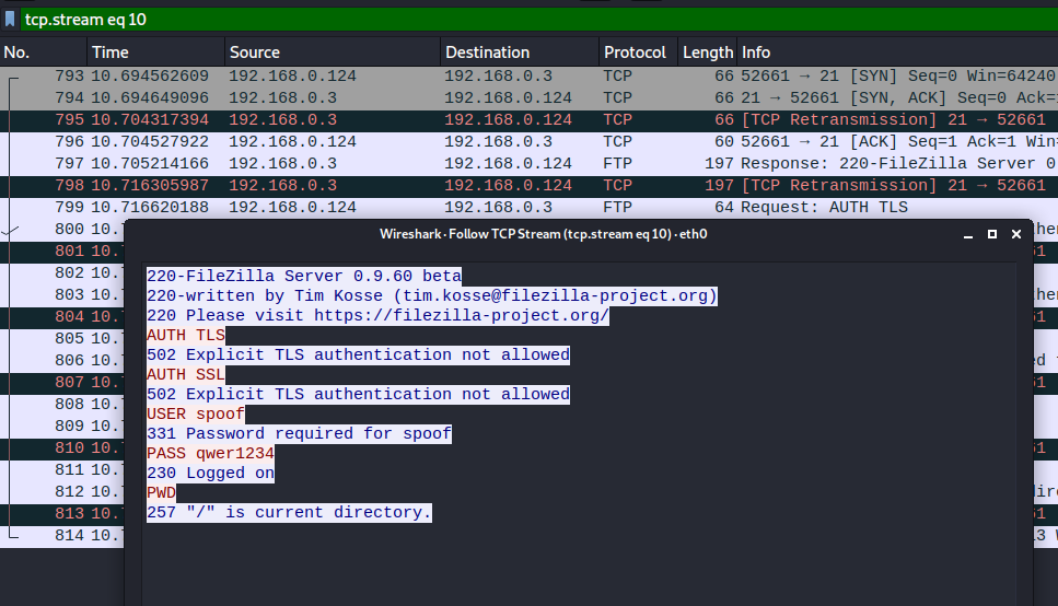 이렇게 스푸핑 공격을 해서 스니핑을 할 수 있다면 암호화가 안된 패킷을 훔쳐볼 수 있다. 위 사진은 FTP의 로그인 과정이 캡처된 사진이고, 사용자 계정과 비밀번호가 그대로 노출되고 있다.