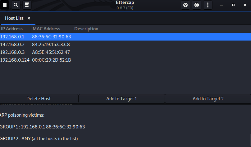 칼리리눅스의 'ettercap' 라는 중간자 공격(MITM) 툴을 사용해서 호스트 A, B를 속일수 있습니다.