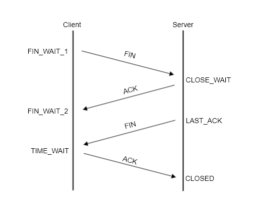 4. 서버는 FIN 패킷을 보내고 LAST_ACK 상태가 되고, FIN을 받은 클라이언트는 ACK를 서버로 보낸 후 TIME_WAIT 상태로 변경하여 잉여 패킷을 기다린다.